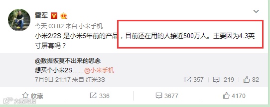 今天凌晨,小米CEO雷军在微博上透露,小米2/2S是小米5年前的产品,目前还在用的人接近500万人。对于这个问题,他也比较纳闷,并给出了自己的推测:“主要因为4.3英寸屏幕吗?”