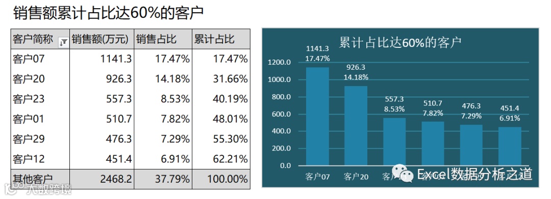 这个任务是:要对比分析各个客户销售额,客户很多,不可能都一一去关注,先要把贡献最大的那些客户找出来。例如,对这些客户进行从大到小排序,找出销售占比累计达到60%的客户是哪些,这个处理,透视表里有一个简单的技能就OK了。