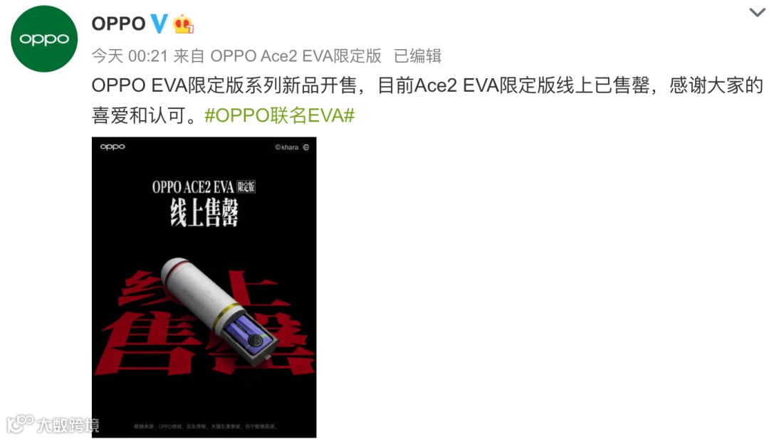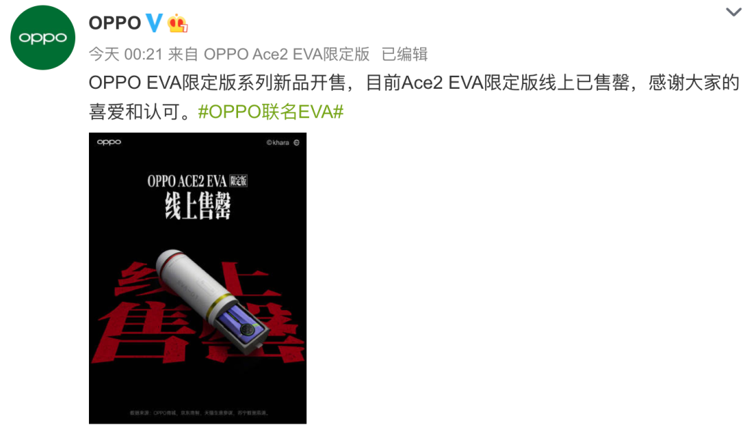 其中全球限量10000台的OPPO Ace2 EVA限定版开售不到半小时,官方就宣布线上已经售罄,小白在下午18点左右看京东页面显示:目前几款EVA版配件里只有手表还可以购买,其他均无法购买,不过这只是线上的情况,线下是否还有货尚不清楚。