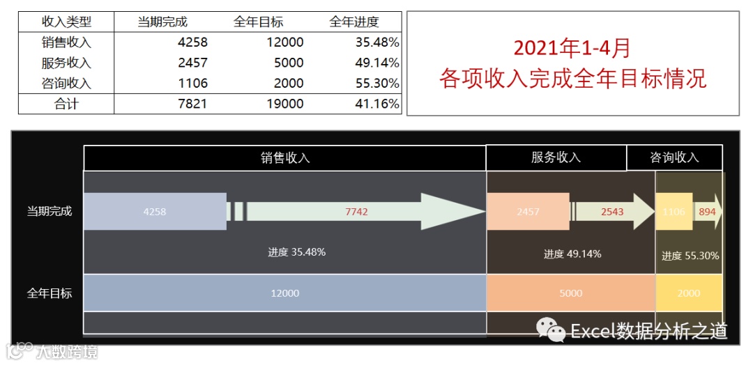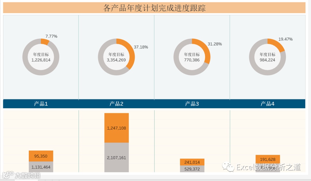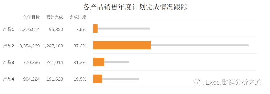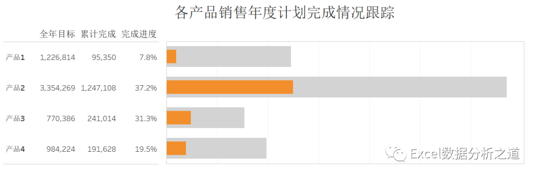 这种跟踪图表,将表格与条形图结合起来,用双轴条形图表示计划和完成情况,不仅可以查看具体数字,还可以直观观察完成进度。