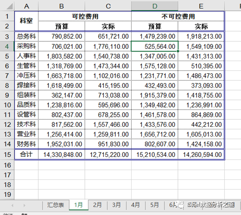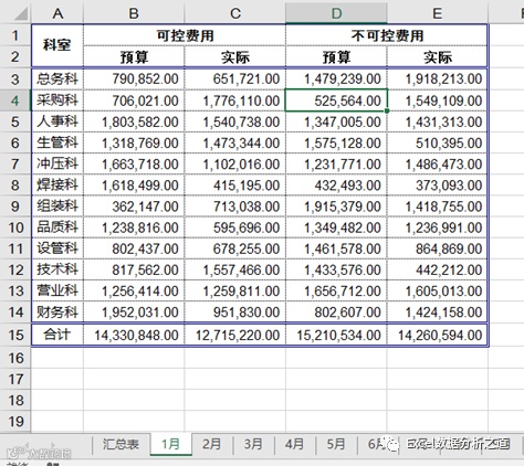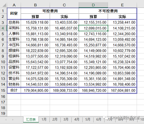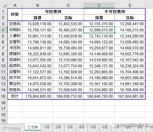 下左图是保存在同一个工作簿上的12个工作表,它们保存全年12个月的预算汇总数据,每个工作表的结构完全相同,也就是行一样多,列也一样多,行顺序和列顺序也一模一样。现在要制作一个汇总表,把这12个工作表的数据加总在一起。