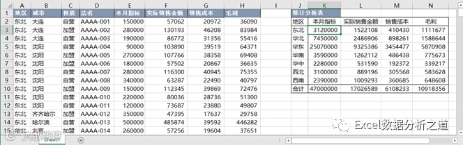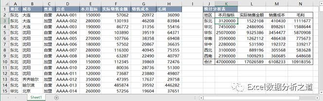 下图是一个销售数据清单,现在要求计算各个地区的总指标、总销售额、总成本和总毛利。
