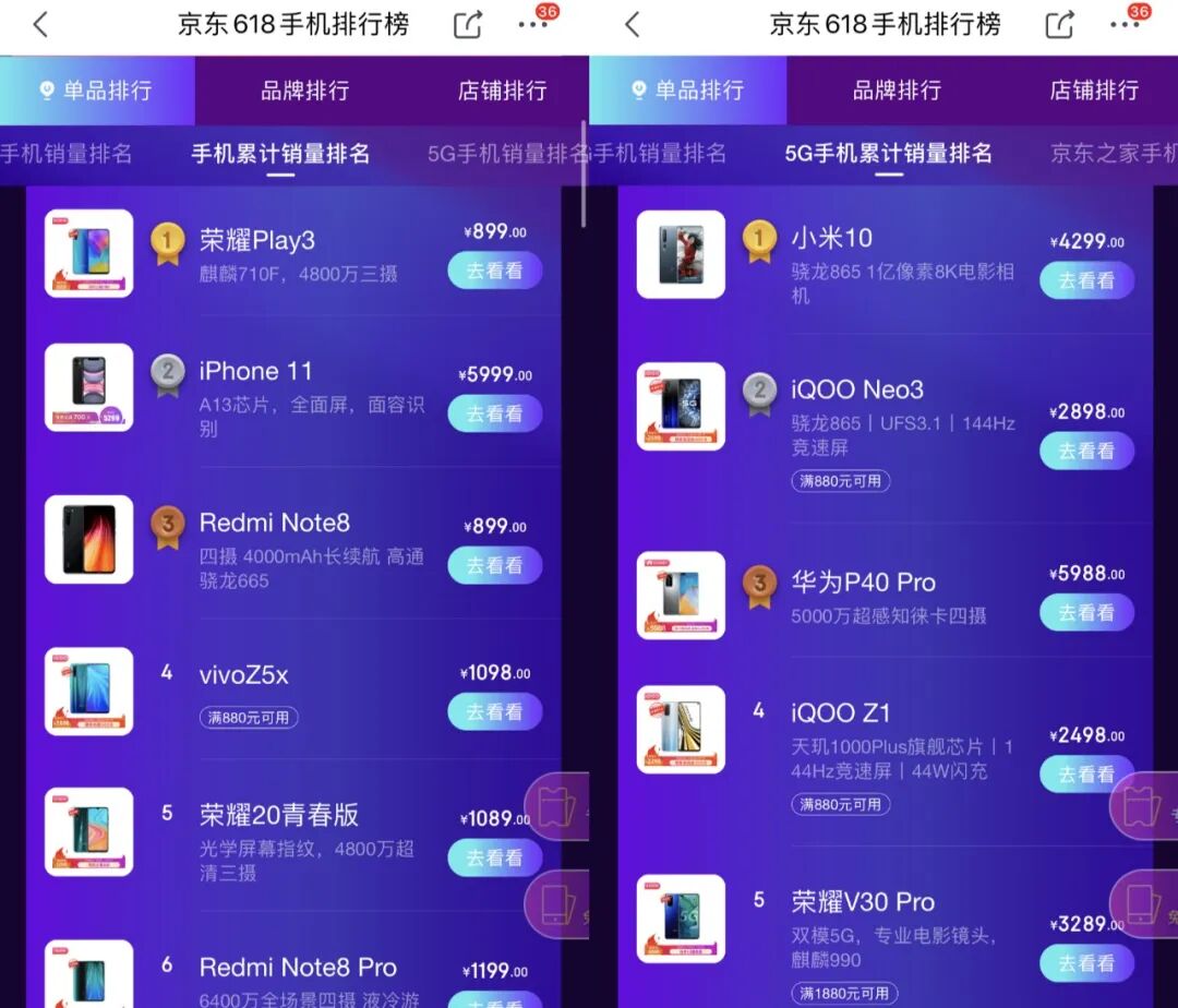 最后我们再来简单回顾一下从6月1日0点起到现在6月7日19:30左右,京东手机累计销量榜,4G手机销量榜TOP 3依次是荣耀Play 3、iPhone 11、Redmi Note8,5G手机销量榜TOP3依次是小米10、iQOO Neo 3、华为P40 Pro,预计后续几天还会有更猛的促销活动。