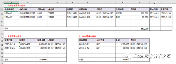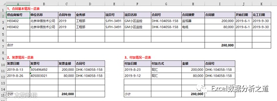 看到了这样一个表格:不同业务数据保存在一个工作表的例子,把合同信息、发票信息、付款信息保存在了一个工作表,不明白为什么是这样设计表格的思路。