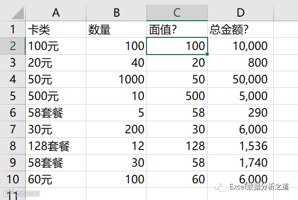 下面是一个实际例子,目前只有A列和B列数据,现在要去提取每个卡的面值,并计算各个卡的总金额。