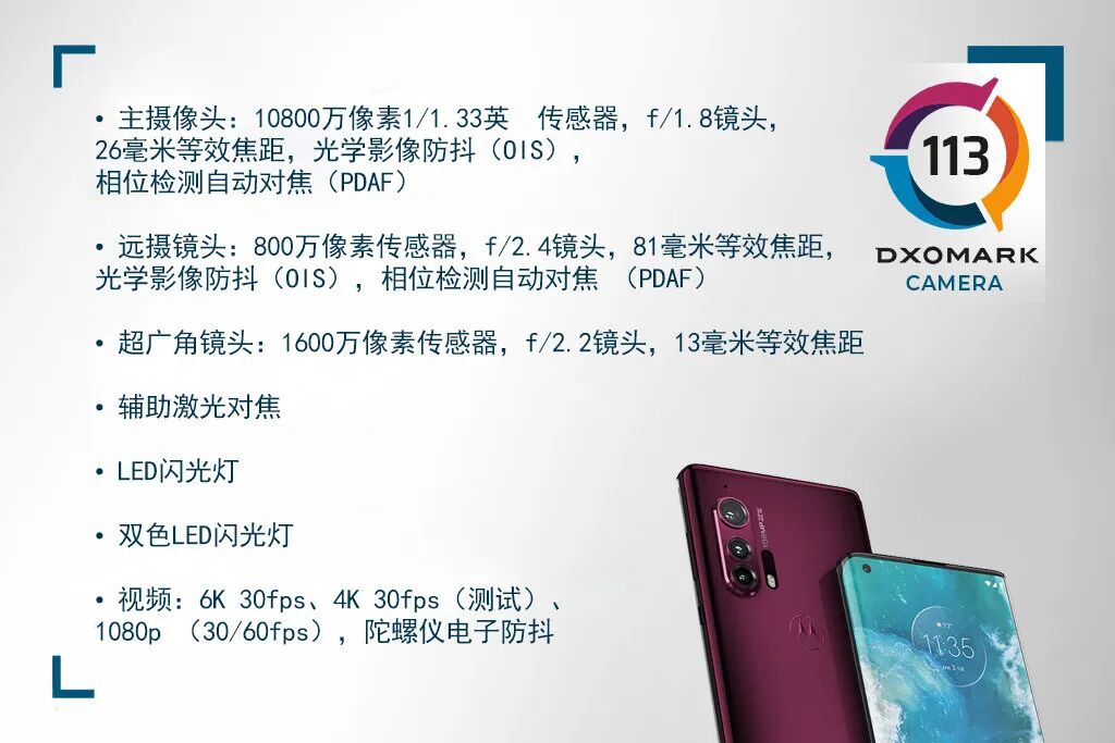 相机参数上据了解,摩托罗拉Edge+后置三摄 主摄为1.08亿像素 F/1.8 有ois光学防抖,4合1像素+800万长焦 有ois,支持3倍光学变焦+1600万超广角+ToF,支持微距照片和录制6K视频等。