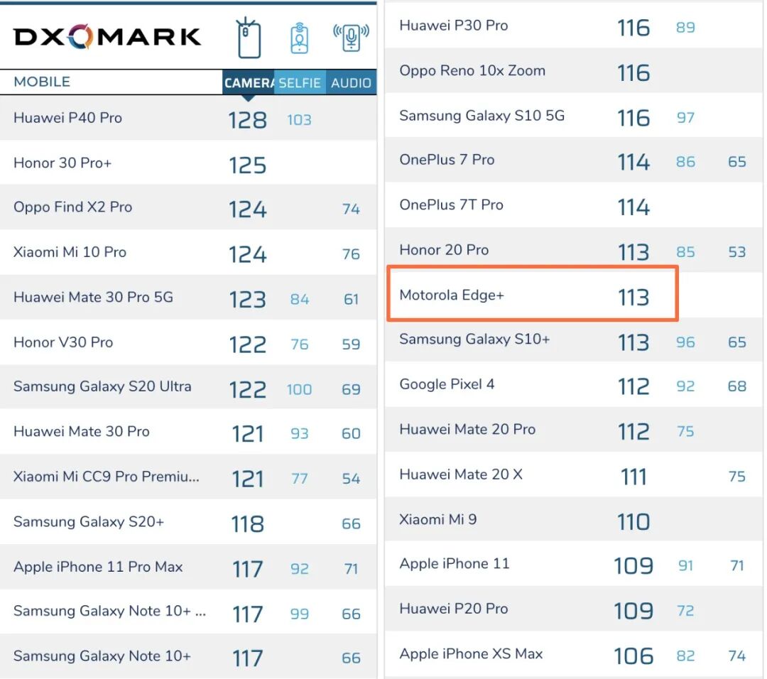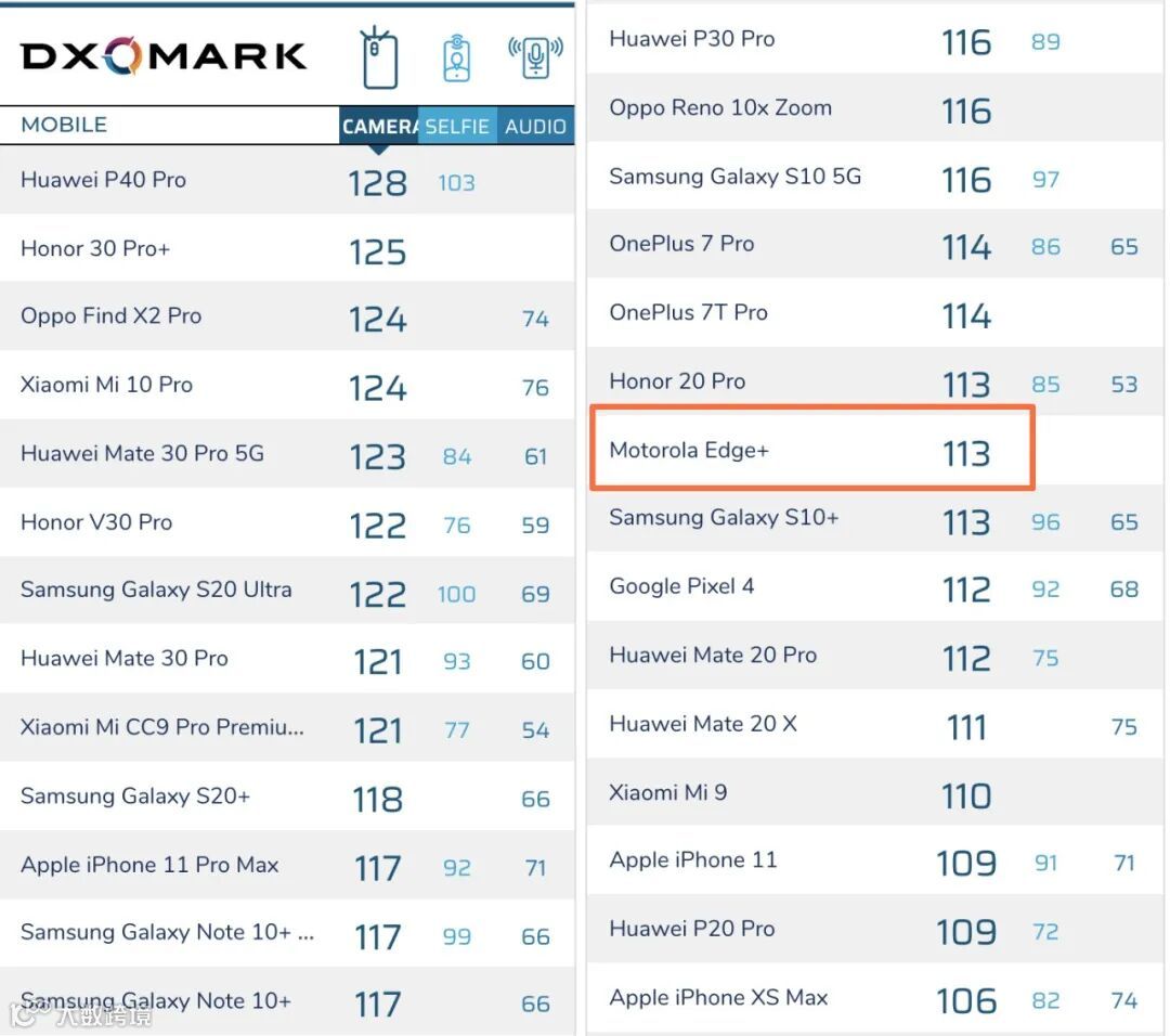 如上图所见,摩托罗拉Edge+在DxOMark后置相机榜排名一般般,在第二页才能找到,综合成绩113分,比第一名的华为P40 Pro低了15分,比同样主摄108MP的小米10 Pro低了11分,直接隶属于第二梯队。