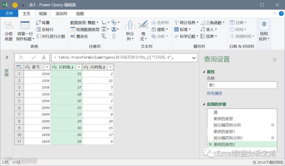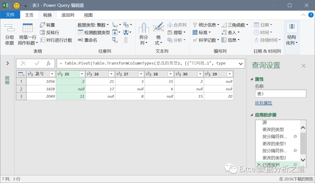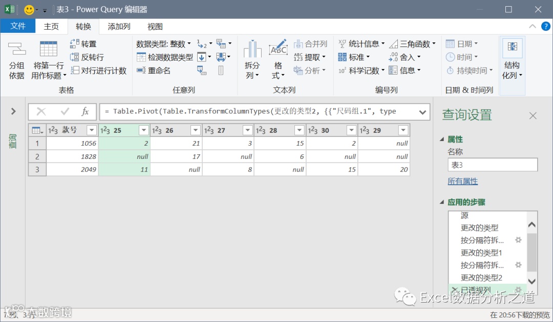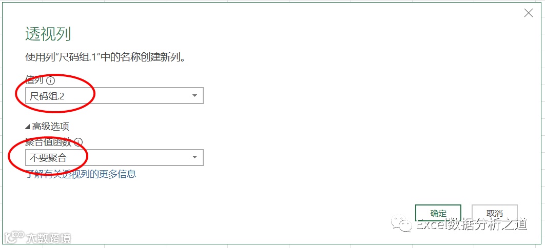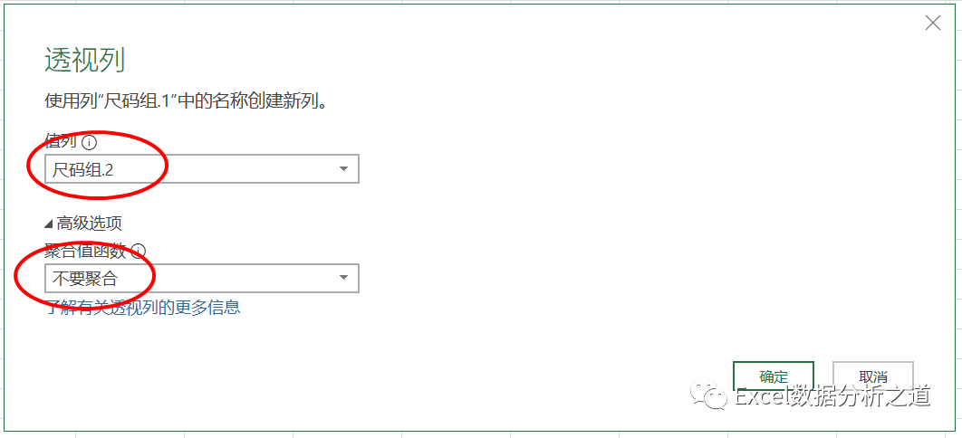 选择第二列,执行“透视列”命令,值列选择“尺码组.2”,并注意选择“不要聚合”,如下图: