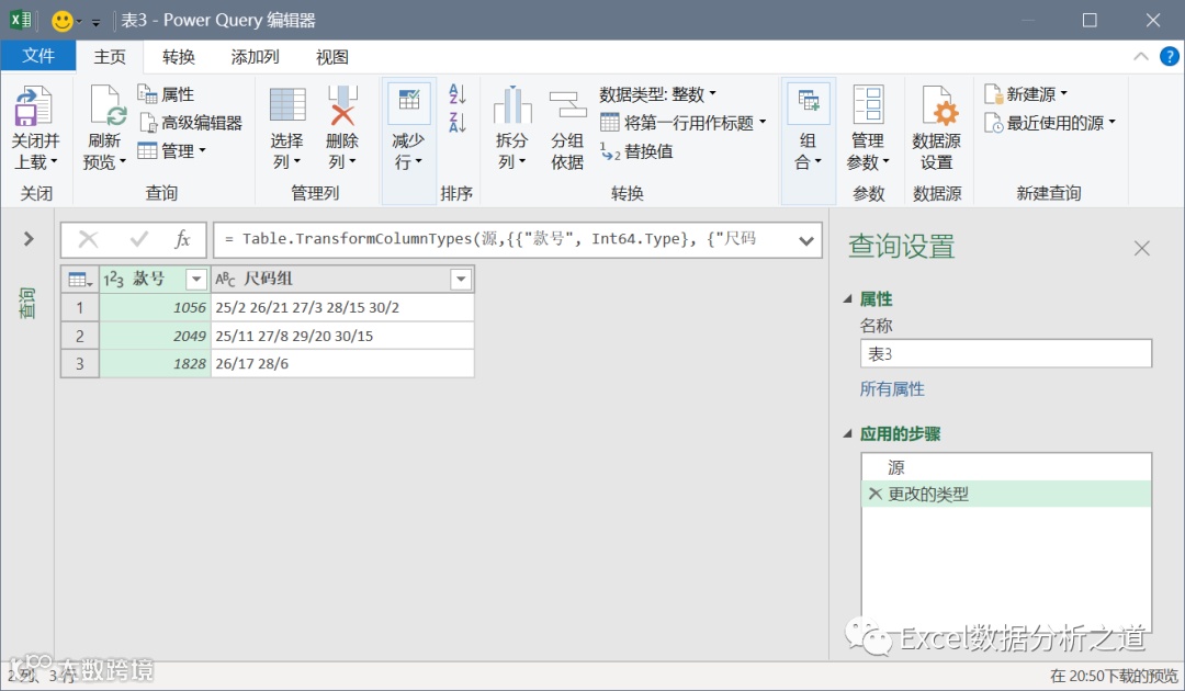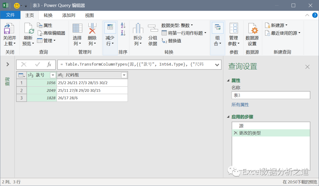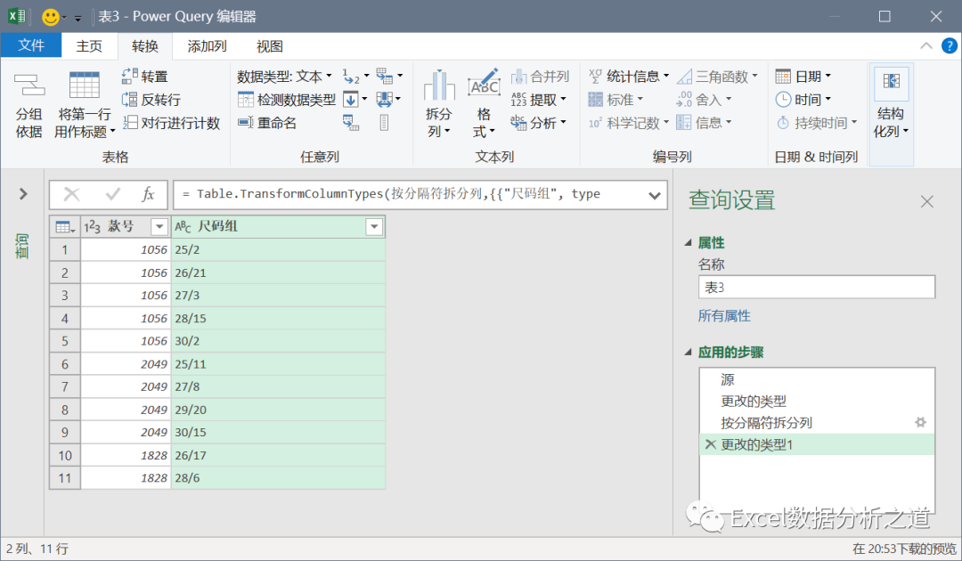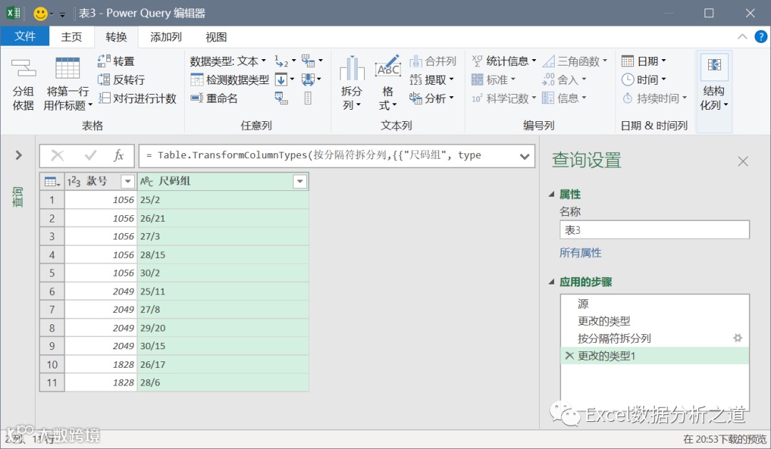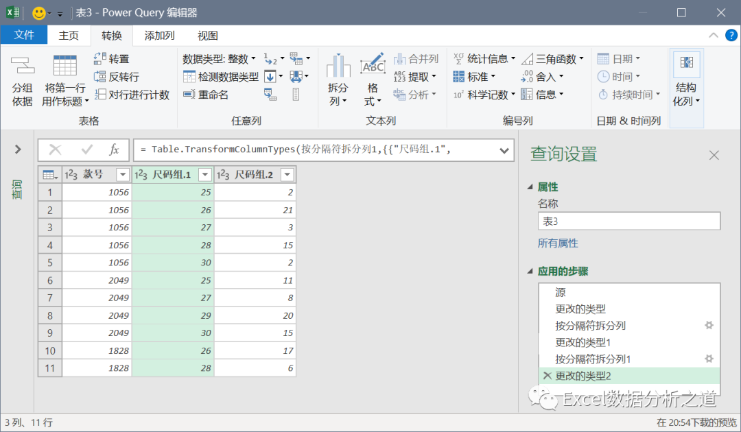 选择第二列,执行“透视列”命令,值列选择“尺码组.2”,并注意选择“不要聚合”,如下图: