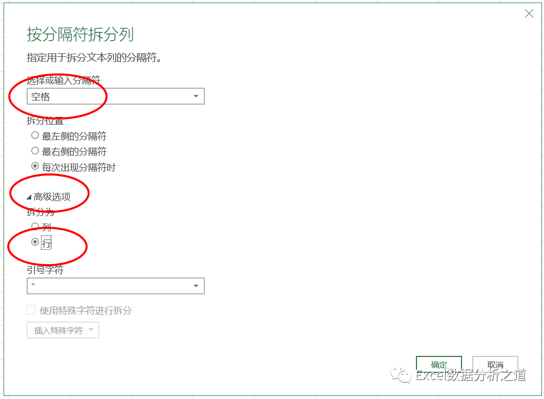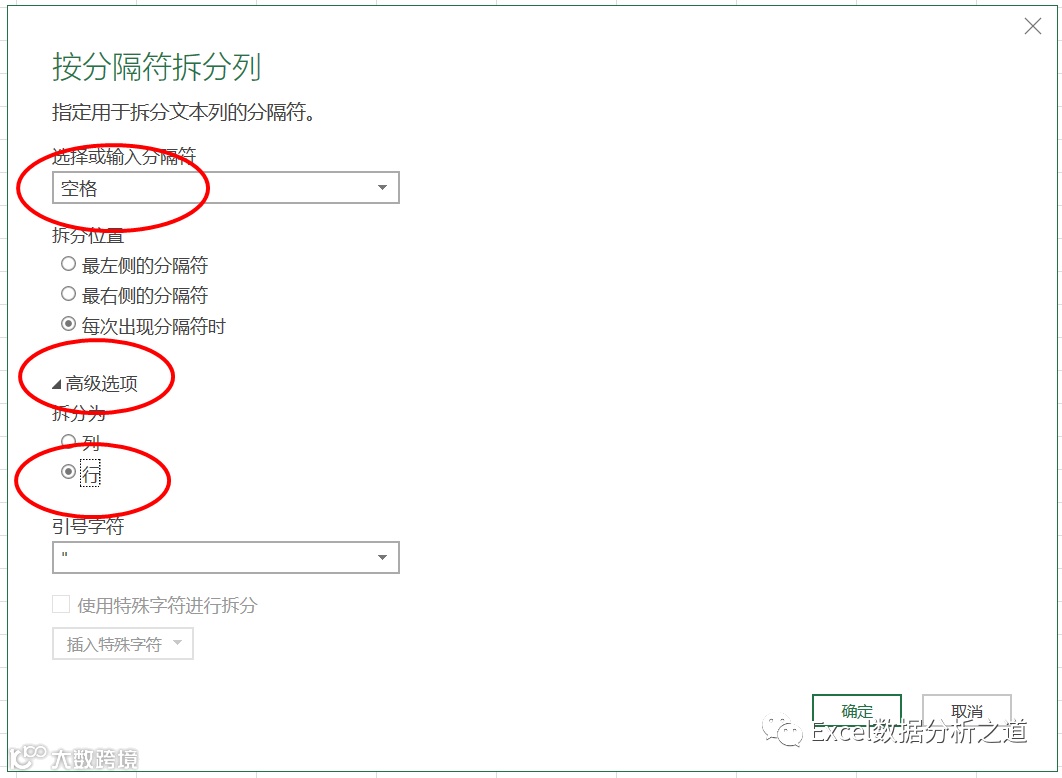 选择第二列,执行“转换”→“拆分列”→“按分隔符”命令,选择“空格”作为分隔符,并选择按“行”分列,如下图: