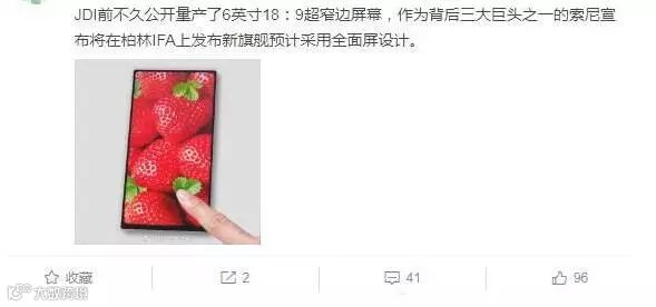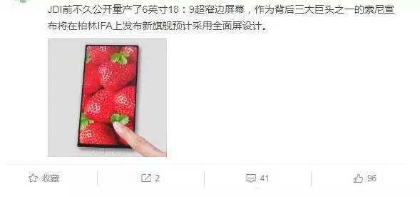 而在此前,JDI前不久公开量产了6英寸18:9超窄边屏幕,而索尼又是JDI幕后三巨头之一,所以说,一段时间之前曝光的索法全面屏新机可能会到来。