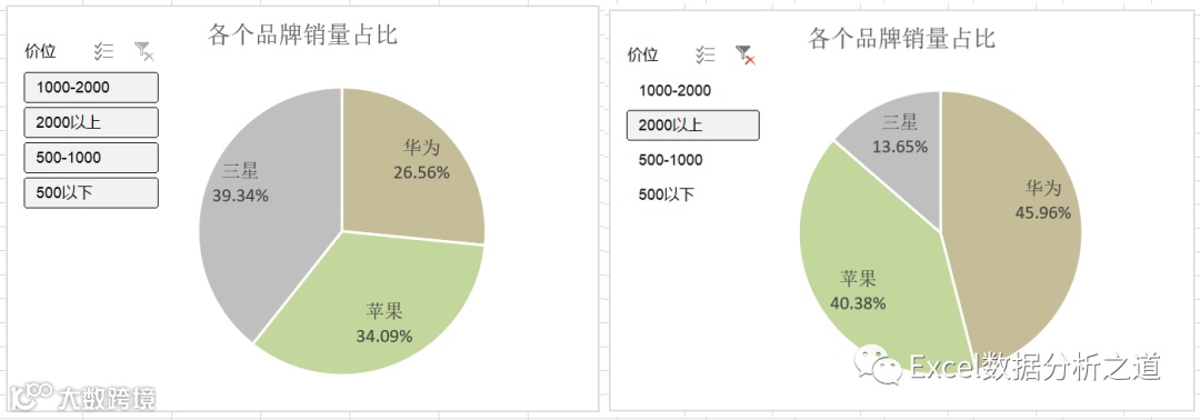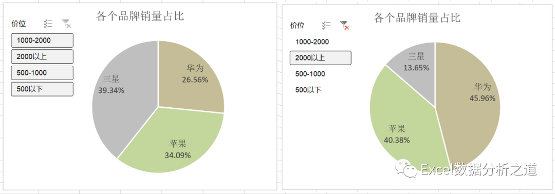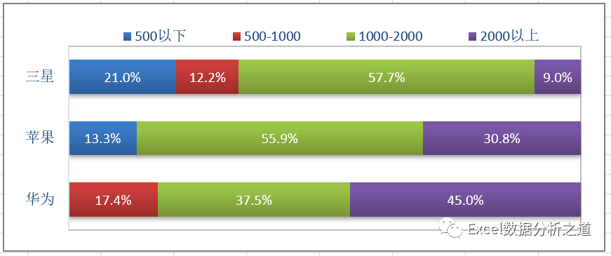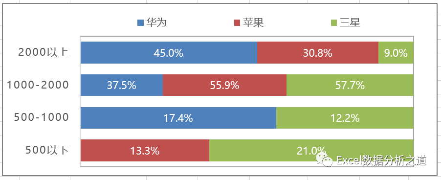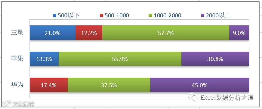 这个分析,涉及到品牌和价位,是一个二维结构分析,肯定不能使用饼图了,但可以使用条形图: