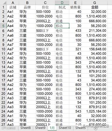 再看B列,是品牌,表示每个品牌手机的销售情况,为什么要分析品牌?至少我们想了解以下的信息:消费者对品牌的喜好和选择,哪个品牌更受消费者待见,但是,这种品牌分析也不是孤零零的,需要结合价位一起分析: