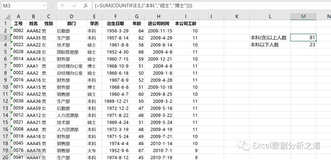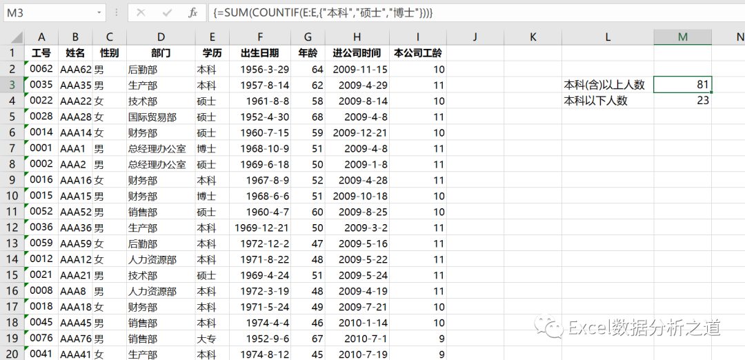 例如,对第一个公式里的 COUNTIF(E:E,{"本科","硕士","博士"}) ,得到的结果分别是本科、硕士和博士的人数,是一个由3个数组成的数组: