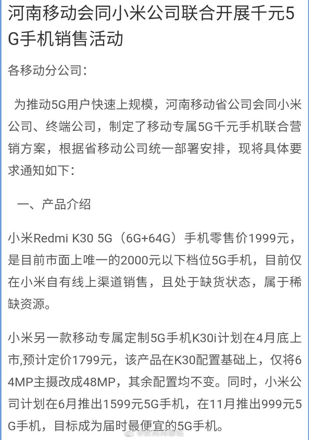 不过需要注意的是,早前@数码闲聊站 曝光的一份中国移动内部文件显示,小米将推出的移动专属定制版5G手机——Redmi K30i配置上:在K30配置基础上 把6400万主摄变为4800万像素,其余配置不变(即仍搭载765G、双挖孔LCD屏、后置四摄其它三颗为8MP+5MP+2MP),预计定价1799元,计划在4月底上市。
