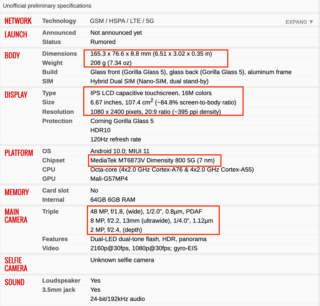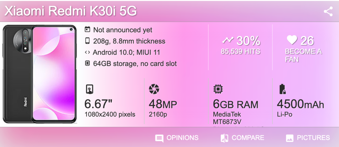 如上图所见,据GSMARENA爆料,Redmi K30i或采用6.67英寸2400*1080分辨率的右上角单挖孔屏,机身厚度8.8mm,重208g,搭载联发科MT6873V(天玑800),4500mAh,后置主摄4800万像素。