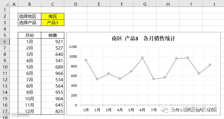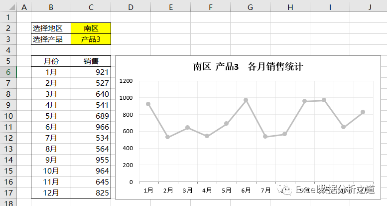 查找出数据后,可以绘制如下的动态图表,查看指定地区和产品的各月销售数据了