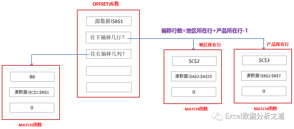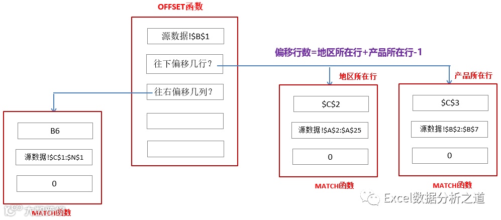一个更简单的思路是利用OFFSET函数直接取数,但是仍然需要使用MATCH函数来定位出位置,以确定需要偏移的行数和列数,其逻辑思维流程图如下,公式为: