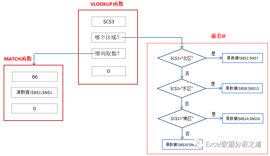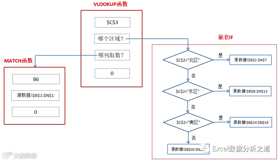 (2)我们需要从4个区域查找数据,这个可以使用嵌套IF来解决;