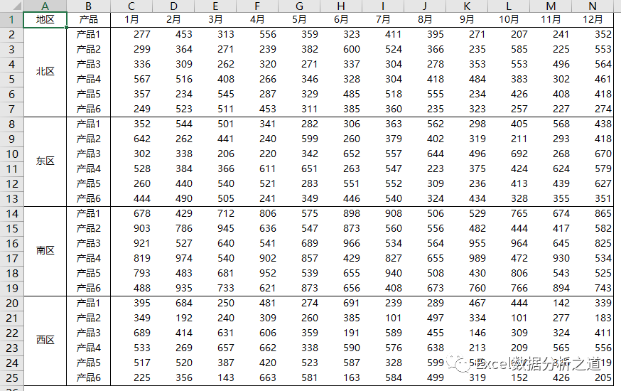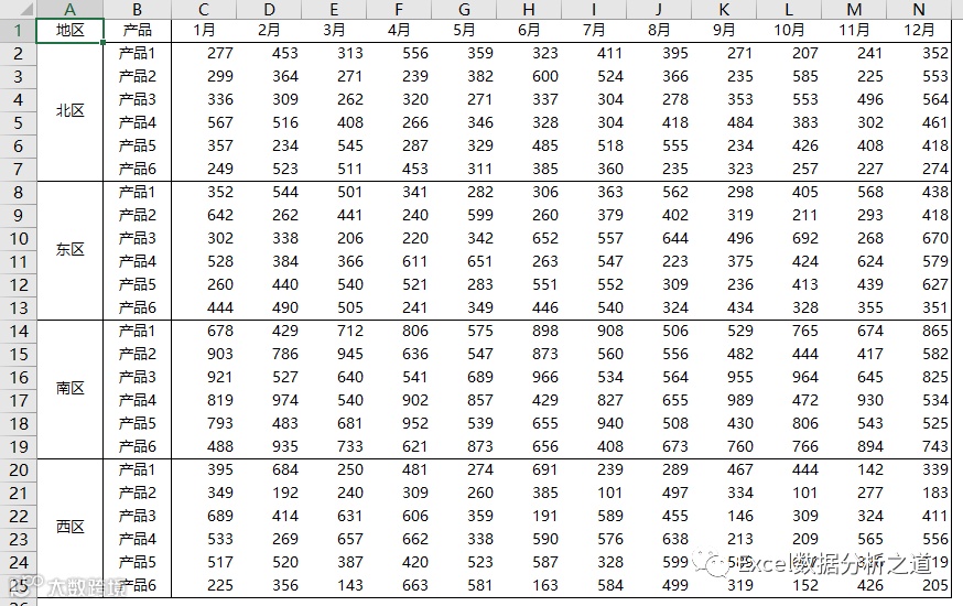 分析指定地区、指定产品在各个月的销售波动及趋势,那么地区和产品是两个可选变量,可以使用控件或者数据验证来选择要分析的对象(这里使用数据验证),而月份是第3个变量。因此,这个问题实质上就是查找满足3个条件的数据了。