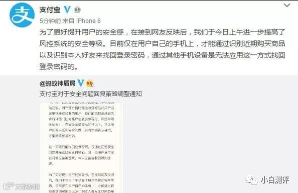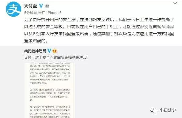此外,支付宝表示,在今天上午接到网友反映后,我们也进一步提高了风控系统的安全等级。目前仅在用户自己的手机上,才能通过识别近期购买商品以及识别本人好友来找回登录密码,通过其他手机设备是无法应用这一方式找回登录密码的。也就是现在没问题了。