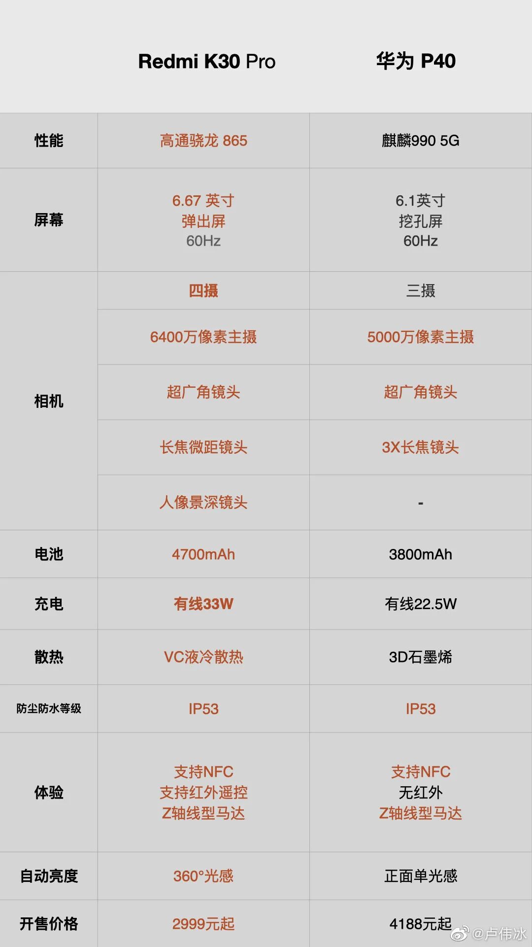 昨晚,华为P40系列国行正式发布,Redmi卢伟冰也在第一时间进行了吐槽,并运用了常程惯用的“一图式对比吊打”。