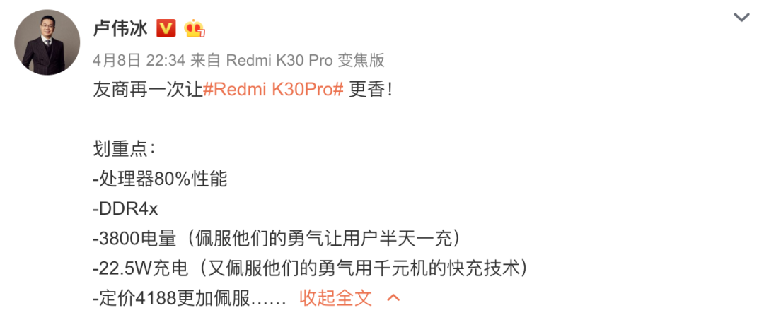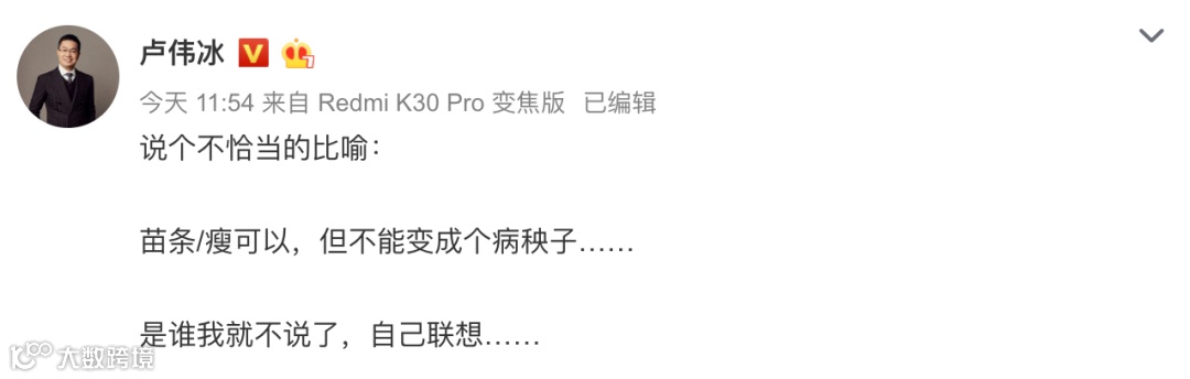 今天中午,卢伟冰还再次暗喻 华为P40标准版 可以阉割,但不能变成个病秧子阉割过多。(卢总这盯紧了友商 经常性吐槽不得不说已经快习惯了,要是哪天没见反而不习惯... 不知道常掌柜那边还会来对比不~