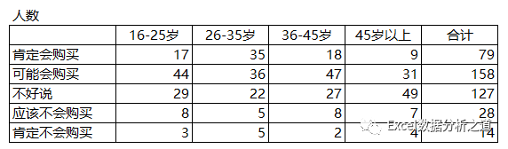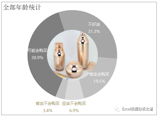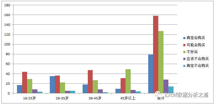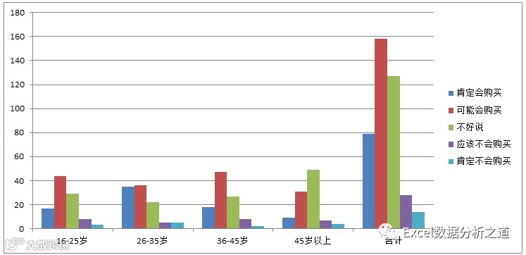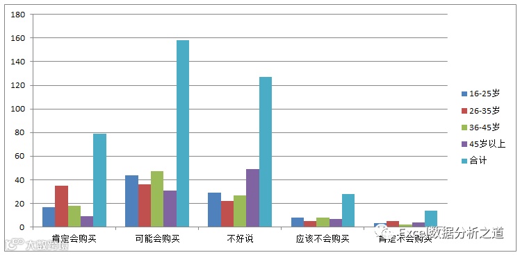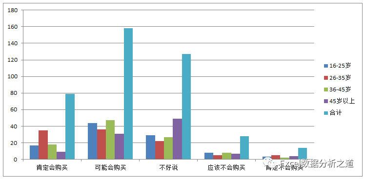 从全部年龄统计,下面的图表可以清晰看出购买意愿的分布: