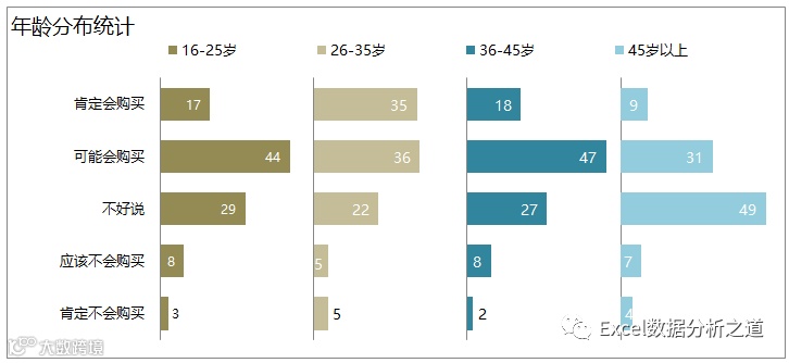 从各个年龄段来看,下面的图表是不是可以更加清晰看出购买意愿?
