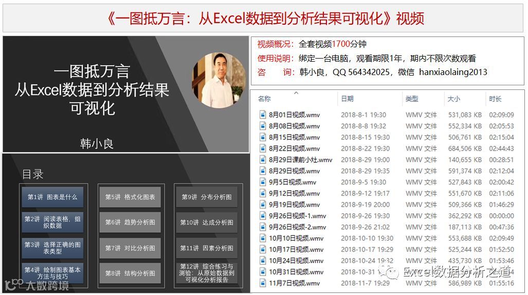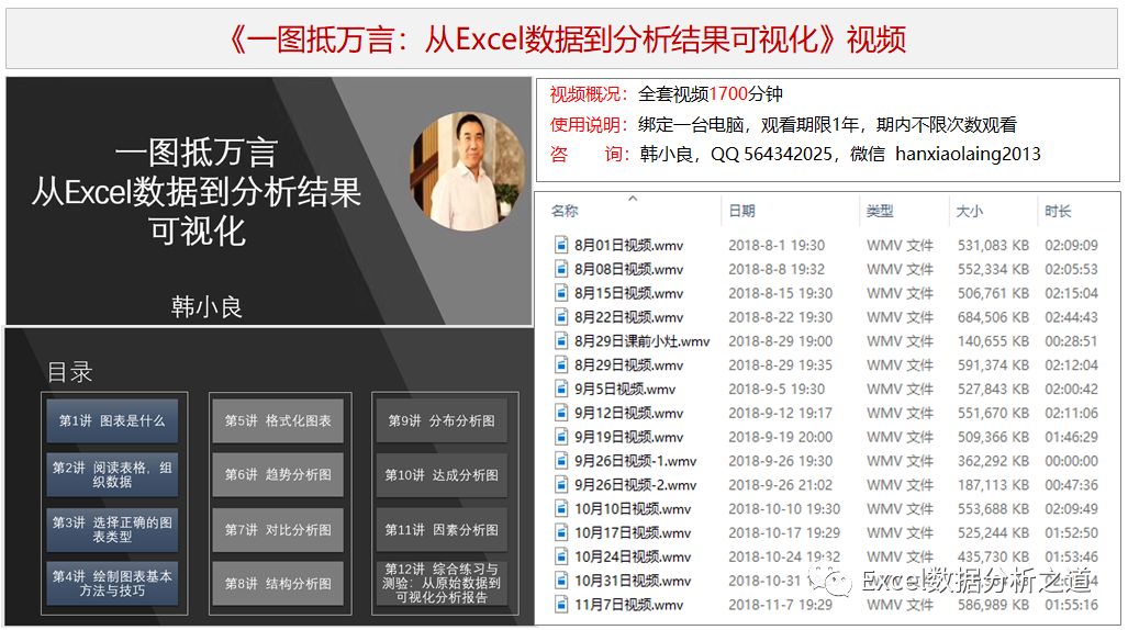 1700分钟的《一图抵万言:从Excel数据到分析结果可视化》视频,让你迅速掌握有说服力分析图表的制作技能,获取现成的模板案例。