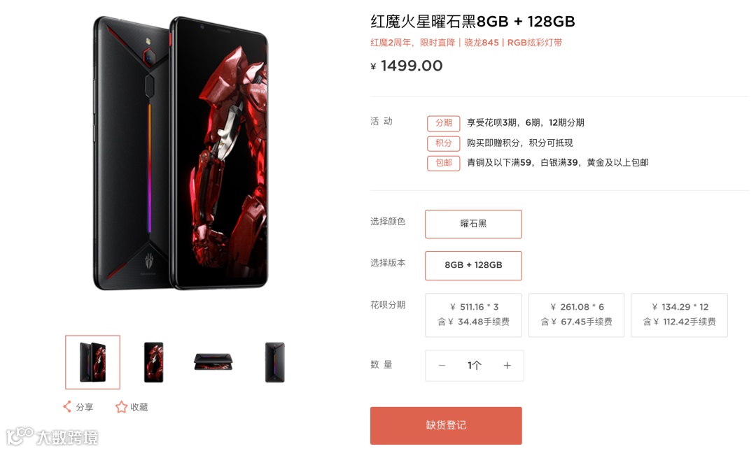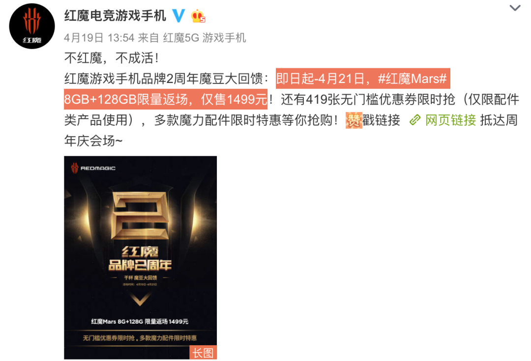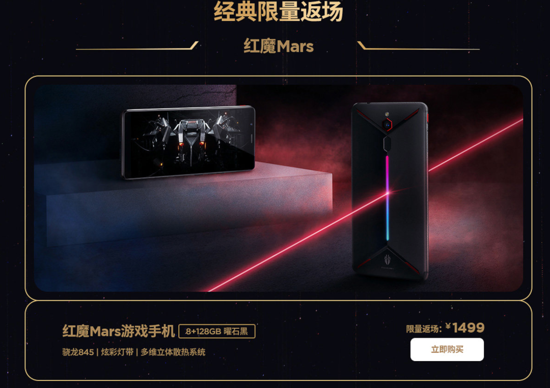 即日起-4月21日,红魔Mars 8GB+128GB版在官网限量返场,仅售1499元。(乍一看这个价还蛮不错,虽然和闲鱼等二手平台上的红魔Mars有些差距,但毕竟是官方渠道售卖,质量有一定保障。