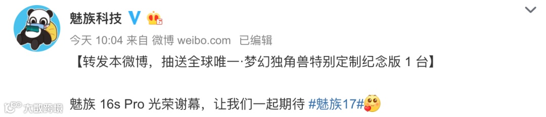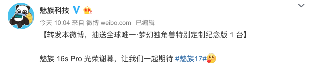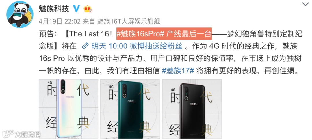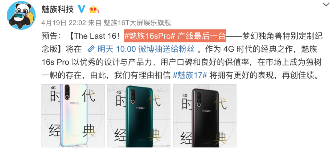 此外,魅族官方微博还晒出了 产线最后一台 魅族16s Pro梦幻独角兽特别定制纪念版,并发起了转发抽奖活动。感兴趣的小伙伴可以参与一波。