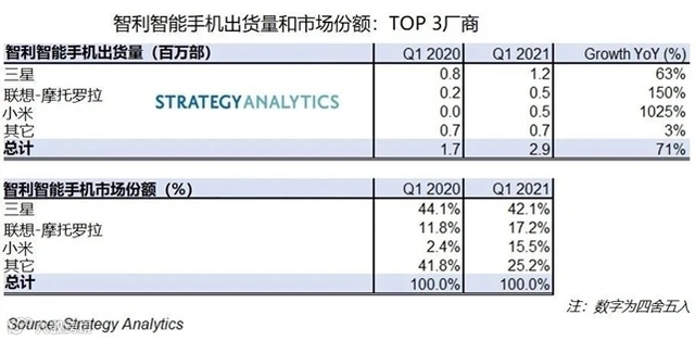 据市场研究机构 Strategy Analytics 数据显示,2021年 Q1 智利智能手机出货量同比增长71%,达到创纪录的290万部。而其中,小米表现最为抢眼,以50万部的出货量夺得市场第三名,年同比增长高达1025%,成为该地区增长最快的智能手机品牌。与此同时,小米在智利的市场占有率也从去年同期的2.4%上升至15.5%。