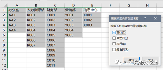 当工作表的数据区域有行标题或列标题时,而我们希望把这些标题文字作为名称使用时,就可以利用“根据所选内容创建”命令自动快速定义多个名称。具体步骤是: