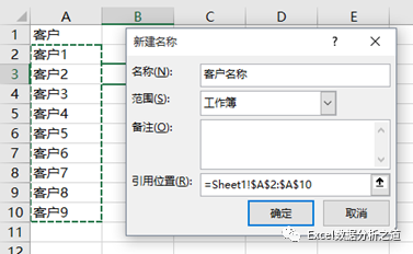 使用“定义名称”对话框来定义名称,就是执行“定义名称”命令按钮,在打开的“新建名称”对话框中定义名称,如下图所示,步骤如下。