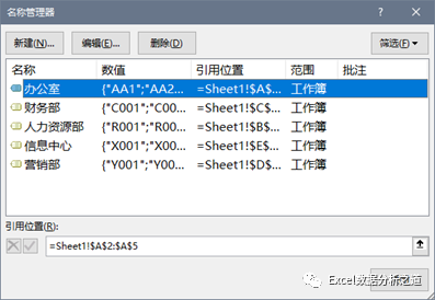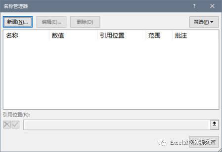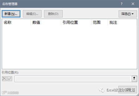 如果一次要定义几个不同的名称,可以执行“公式”→“名称管理器”命令,打开“名称管理器”对话框,再单击“新建”按钮,如下图所示,就打开“新建名称”对话框,定义好名称后,就又返回名称管理器,所有名称都定义完毕后,再关闭名称管理器。