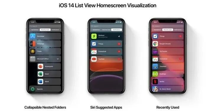 界面上,9to5Mac爆料称iOS 14将新增一个列表视图,用户可以在一个从上到下的滚动列表页面中查看所有的App,同时这个列表视图还提供多种分类功能,支持查看最近使用或有未读通知的APP,支持Siri智能建议比如你到某个地方打开你在这个地方常用的APP等等。