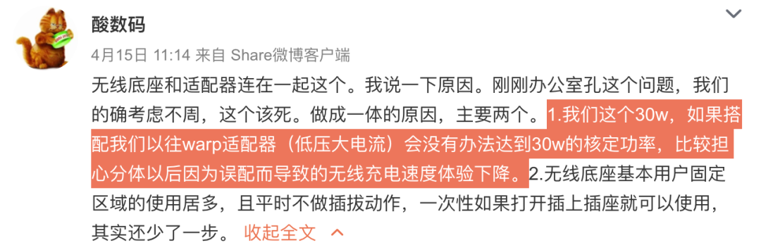 对于这点,一加产品经理回应称:1.如果搭配以往Warp适配器(低压大电流)会没有办法达到30W的核定功率,比较担心分体以后因为误配而导致的无线充电速度体验下降。2.无线底座基本用户固定区域的使用居多,且平时不做插拔动作。(并表示如果使用其他无线充电器,功率最大应该是10W左右)。