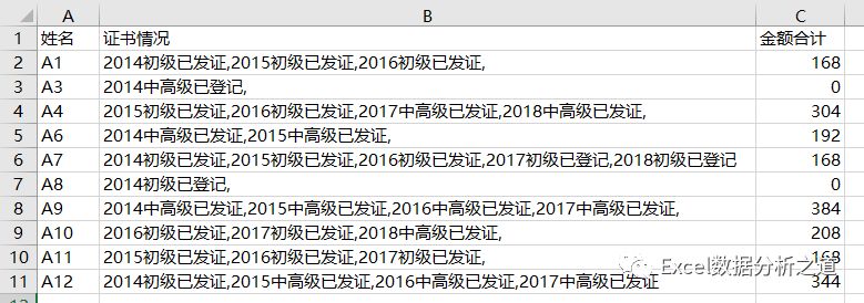 一个学生问了这样一个问题:有一个表格,记录每个人的获得证书情况,每个“初级已发证”给56元,每个“中高级已发证”给96元,请计算每个人的实际总金额。模拟数据如下。