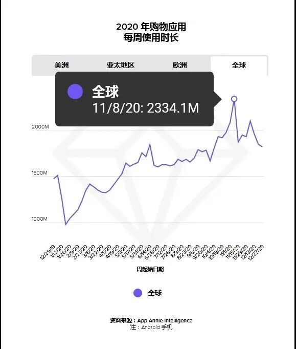 根据 App Annie 最新发布《2021 年移动市场报告》,2020 年全球购物应用每周使用时长实现了较大增长,如果去除中国来计算,2020 年全球购物应用使用时长同比增长了 45%。