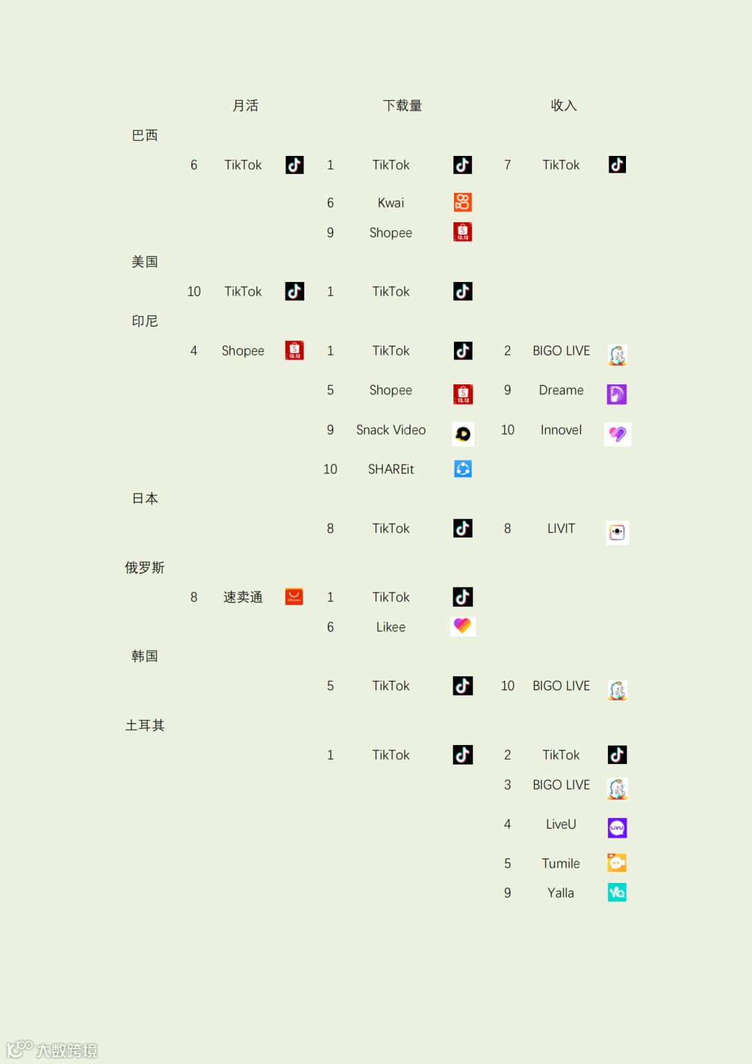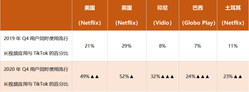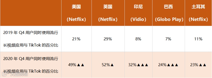2020 年 Q4 美国 Netflix iOS 端用户使用 TikTok 的渗透率是去年同期的 2.3 倍。这个比例在新兴市场更为夸张,在印尼是 4 倍、在巴西是 3.4 倍....