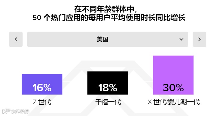 首先用户年龄角度,X 世代、婴儿潮一代这些年龄相对较大的用户群体,在 2020 年的移动设备使用时长反而呈现出了更强的增长势头。根据 AppAnnie 提供的数据显示,X 世代/婴儿潮一代在 50 款热门应用中的平均使用时长同比增长 30%,相比之下 Z 世代为 16%,千禧一代为 18%。除了美国,英国也呈现出老一代用户在 2020 年使用时长增长更多的趋势。