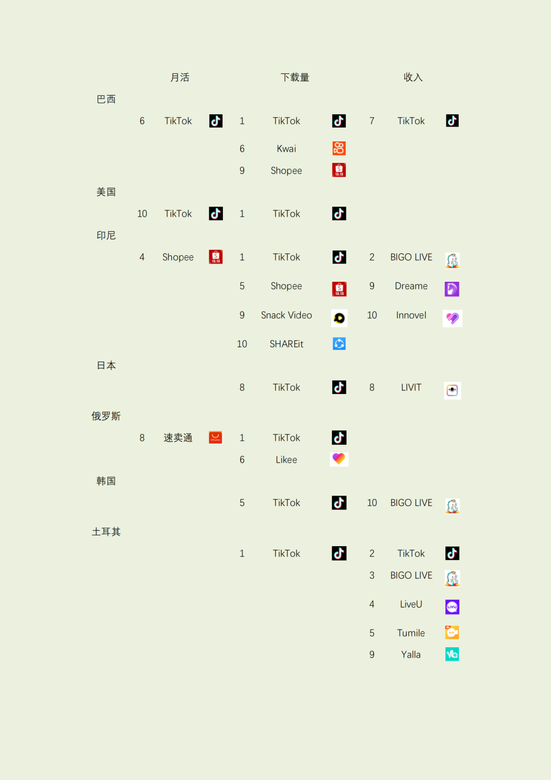 从用户使用时长角度来看,TikTok 稳居美国、印尼、日本、英国、巴西等中国出海热门市场的社交 App 用户使用时长 Top5,而且在各个国家均有明显增长。