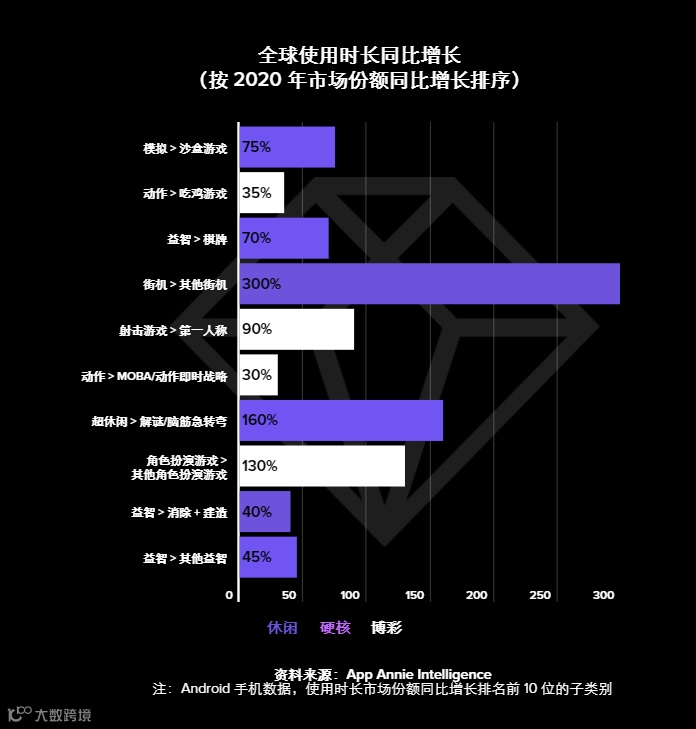 App Annie 的报告将游戏大致分为了 3 类:硬核游戏、休闲游戏和博彩游戏。过去一年,一些重度游戏和更轻的超休闲游戏都有“往中度走”的趋势出现,推动了休闲游戏的发展。