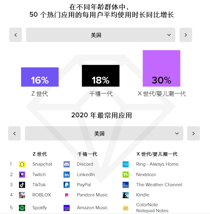 下面先来关注一下去年移动设备使用时长增长最多的 X 世代和婴儿潮群体。总结一下,这个群体最常用的应用有两个特点,一是偏工具属性,排名第一的 Ring 是一款帮助用户可以随时随地从移动设备监测自己家门口访客的工具,后面还有看天气的 The Weather Channel、看书的 kindle 和备忘录工具 ColorNote,这反映出美国老一代人群的移动设备使用更注重实用,而不像年轻一代那样喜欢线上的社交娱乐活动。