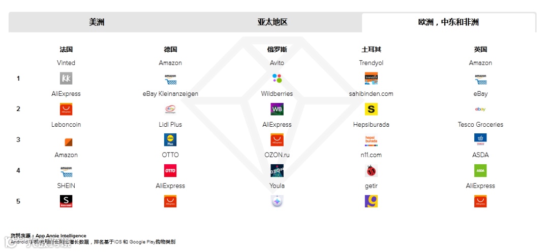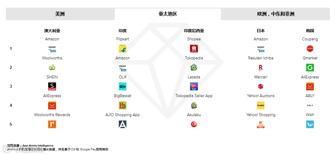 亚太地区和中东、非洲国家都有发展较好的本土 APP 和外来 APP,其中 Shopee 在印尼等东南亚国家和巴西都有很不错的渗透率。另外,AliExpress 在欧洲、亚太国家以及加拿大也榜上有名。