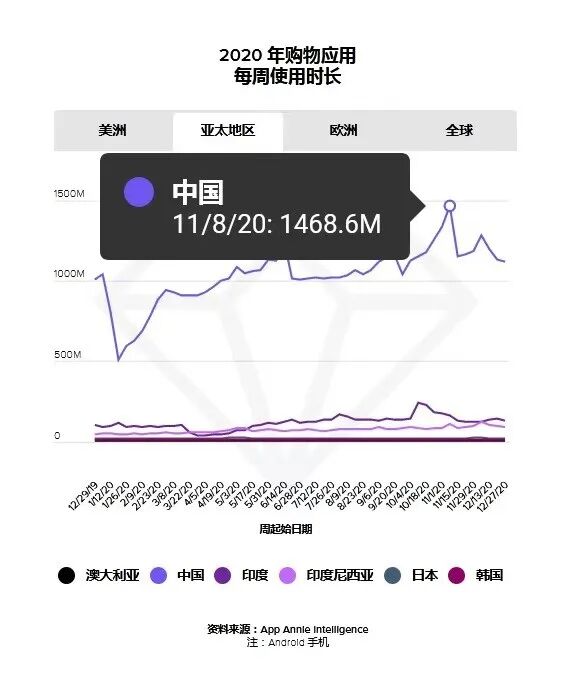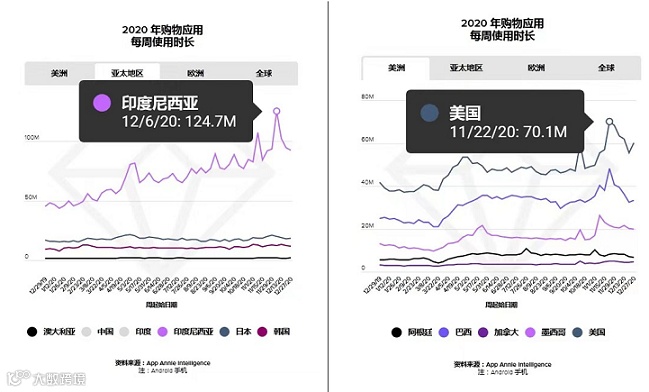 分地区来看,亚太新兴市场人群移动端使用时长仍远高于欧美成熟市场。例如,印尼每周使用时长最高超过 1.24 亿分钟,而美国作为 2020 年电商发展飞快的典型成熟市场,每周使用时长最高也只有 701 万分钟。