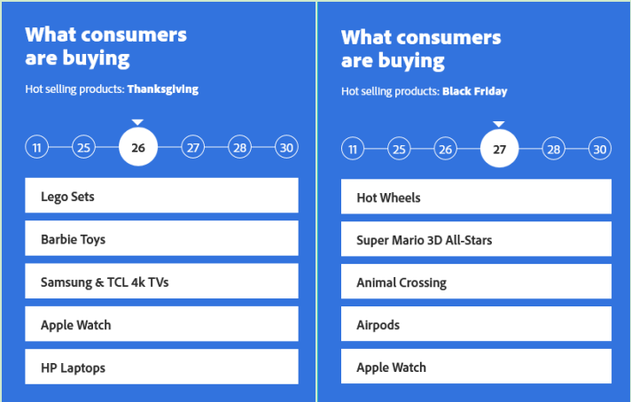 购物行为向移动端的转移,更容易在成熟市场转化为收入。据统计,2020 年 11 月 1 日至 12 月 9 日,也就是感恩节和黒五网一期间,美国移动设备上的支出实现 532 亿美元,同比增长了 55% 以上,而在这些购物日,美国用户最喜欢购买 3C 产品和玩具游戏类产品。