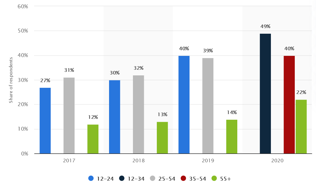 3、播客对海外年轻群体的吸引力很高。Z 世代用户最常用的应用中,Spotify 排到第 5 位,而在千禧一代中,Pandora music、Amazon music 也受到欢迎,在这些音乐流媒体应用中,年轻用户不仅听音乐,还会听播客。根据 Statista 的数据显示,2020 年有 49% 的 12~34 岁的美国用户会每月听一次播客,是比例最高的一个群体。