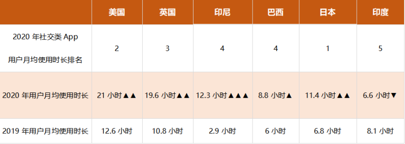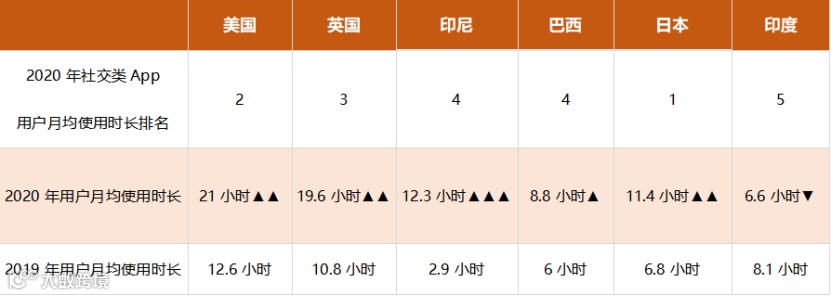 根据 App Annie 数据,2020 年 TikTok 美国安卓用户的月均使用时长最长,达到了 21 小时,同比增长 66.67%;在印尼市场增长最快,由 2019 年的 2.9 小时增至 12.3 小时,同比增长 324%,这与 TikTok 2020 年在印尼的投入程度增加有很大关系。